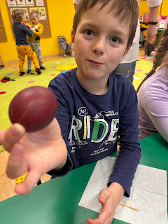 Przygotowując się do Świąt Wielkanocnych przedszkolaki poznały rodzaje i techniki zdobienia świątecznych pisanek. Jednym z tradycyjnych sposób barwienia jest gotowanie jaj w łupkach z cebuli. Takie też przygotowały przedszkolaki a następnie nadawały pięknym ceglanym jajeczkom wspaniałe wzorki i zdobienia.